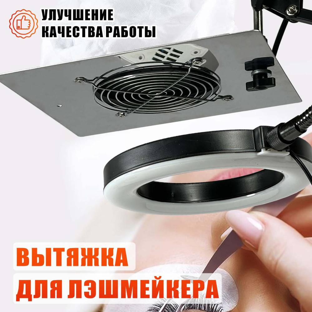 Вытяжка KGS-FAN2 с подсветкой SL-156 — это профессиональное решение для мастеров по наращиванию ресниц, нуждающихся в чистом воздухе, точной подсветке и удобстве в работе. Мощный вентилятор эффективно удаляет испарения клея, неприятные запахи и мелкодисперсные частицы, создавая безопасные условия в рабочей зоне. Благодаря пантографу вытяжку можно легко настроить под любой угол, что упрощает проведение процедур и повышает комфорт как для мастера, так и для клиента. Кольцевая лампа на гибкой ножке обеспечивает точное направленное освещение и позволяет регулировать яркость и температуру света. Конструкция компактно устанавливается на стол с помощью усиленной струбцины и не занимает много места. Комплект включает два мешка и все необходимые крепления — всё для удобной и эффективной работы.