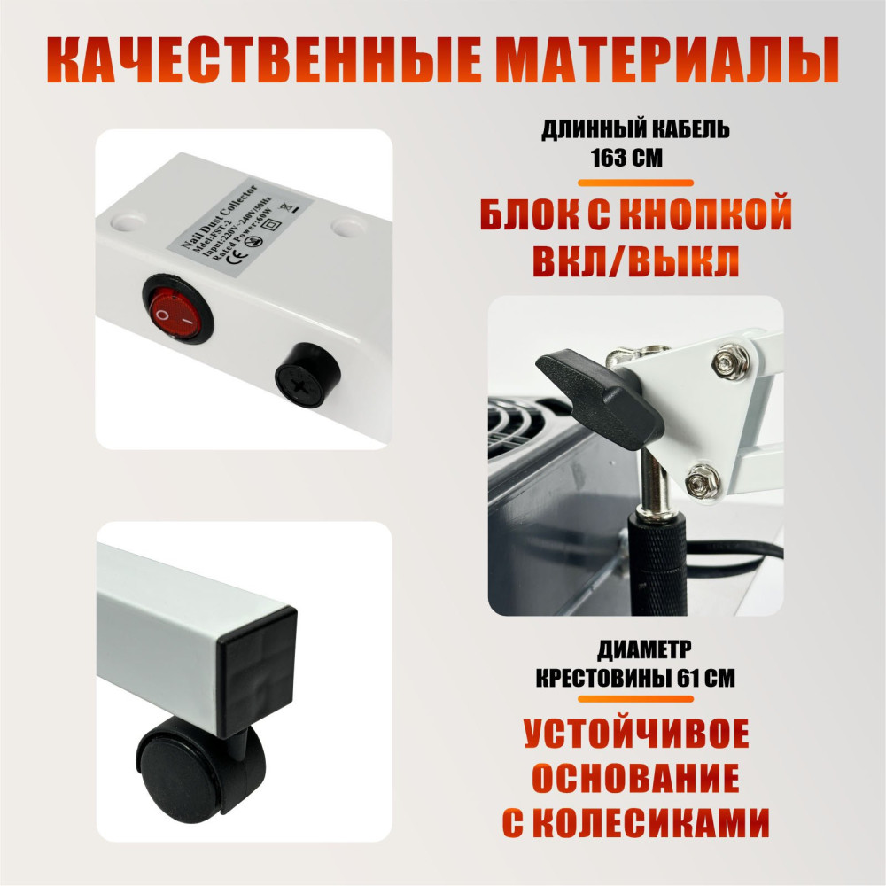 Вытяжка NS-NBW-FAN2 сочетает надежность и удобство. Пантограф позволяет регулировать высоту и наклон вентилятора, а стойка с колесиками обеспечивает мобильность, позволяя менять расположение вытяжки в салоне, офисе или дома. Вентилятор удаляет неприятные запахи, пары клея и пыль, создавая безопасные условия работы для мастера и клиента. Компактные размеры и легкая конструкция позволяют использовать вытяжку как в профессиональном салоне, так и дома, при этом оборудование легко транспортировать и настраивать под рабочее место.