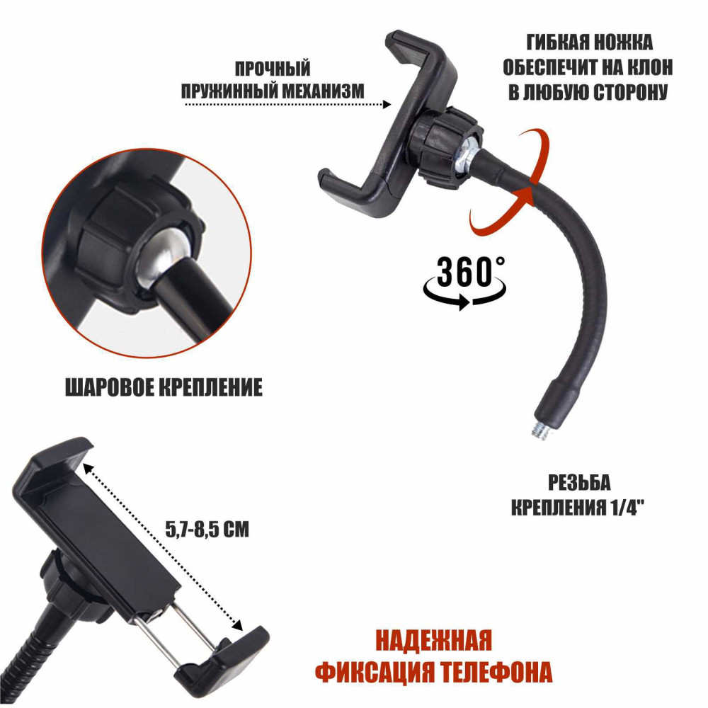 • Держатель телефона: ширина 5,7–8,5 см, длина гибкого основания 14 см, шаровое вращение