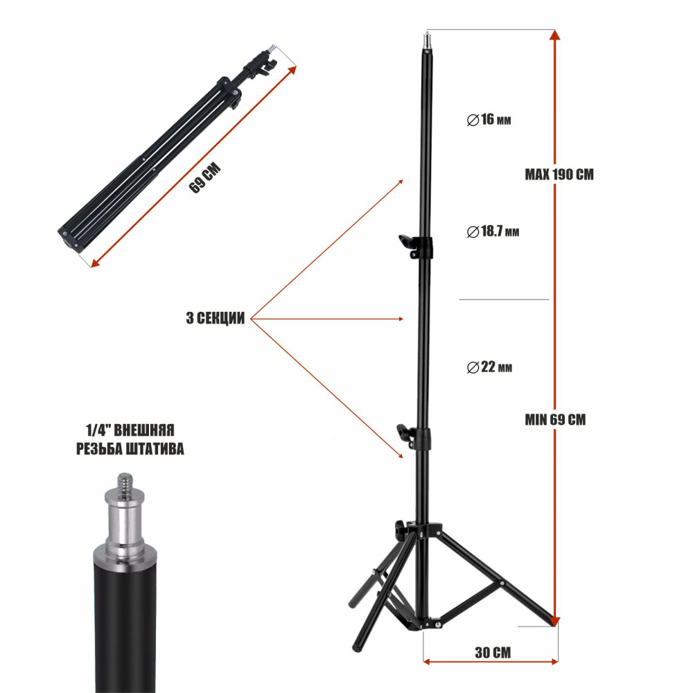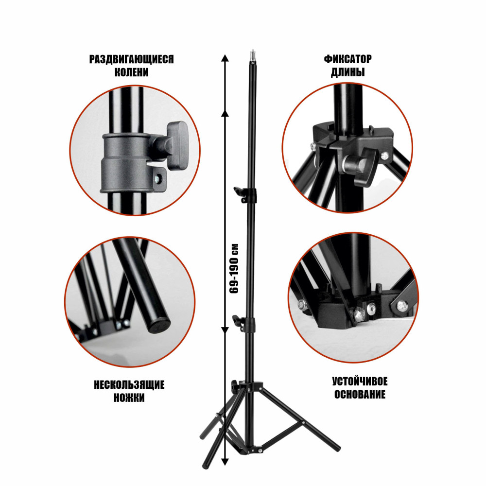 Осветитель PM-26JB оснащён 96 светодиодами и обеспечивает мощный световой поток 4800 Lm для равномерного освещения кадра. Диапазон цветовой температуры 2500–6500К позволяет создавать как теплый, так и холодный свет, а RGB-режимы добавляют динамику и визуальные эффекты для творчества. В комплект входит USB-кабель для питания, благодаря чему осветитель можно подключать к адаптеру, power bank или компьютеру. Напольная стойка JBH выдерживает длительную эксплуатацию, регулируется по высоте от 69 до 190 см и подходит для съемок в любых условиях. Легкая сборка делает комплект удобным в транспортировке и использовании на выезде.