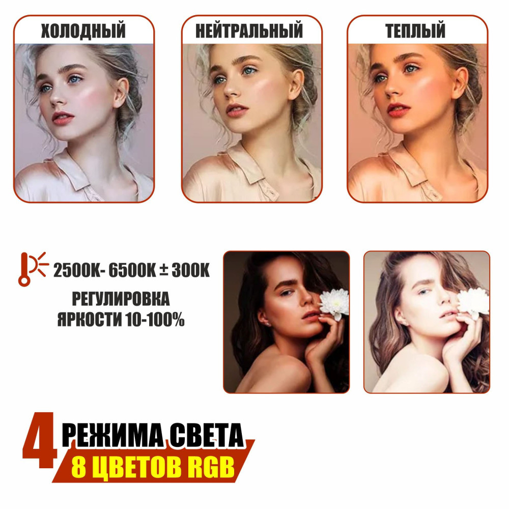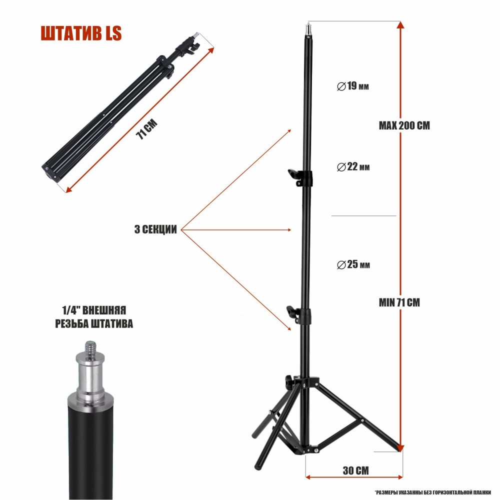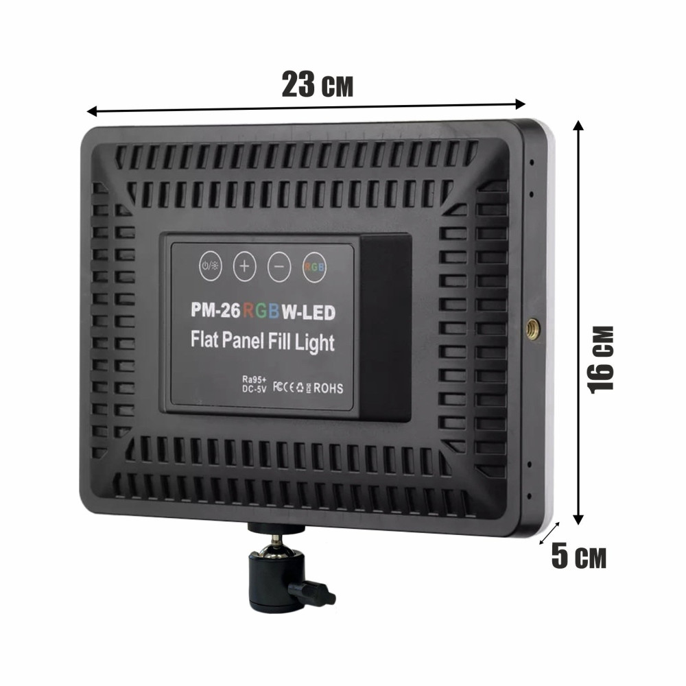 Осветитель RGB PM-26LS сочетает регулируемый белый свет (от холодного до теплого) и RGB подсветку с 8 цветами и 4 режимами работы: мигающий, попеременная смена цветов, два режима плавной смены цветов. Лампа подходит для блогеров, съемки TikTok, Reels, YouTube, стримов и домашней студии. Три резьбовых крепления 1/4" обеспечивают универсальную установку на стойку или штатив, а шарнирное крепление позволяет поворачивать лампу на 360°. Усиленная напольная стойка LS с регулировкой высоты, телескопической конструкцией и противоскользящей поверхностью делает работу комфортной и безопасной.