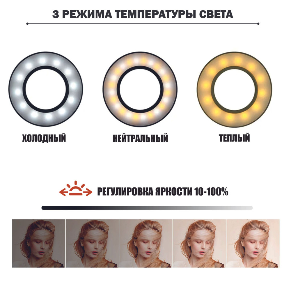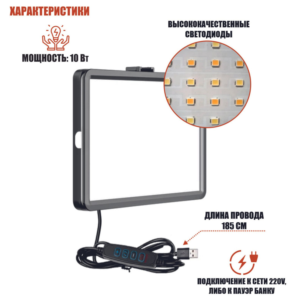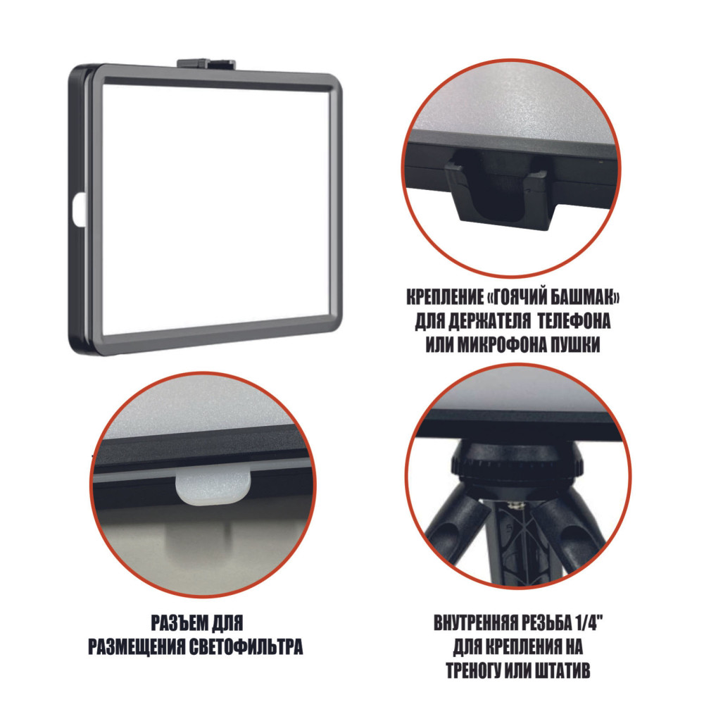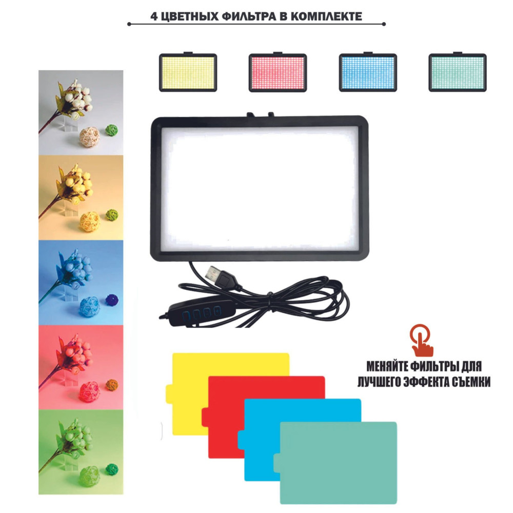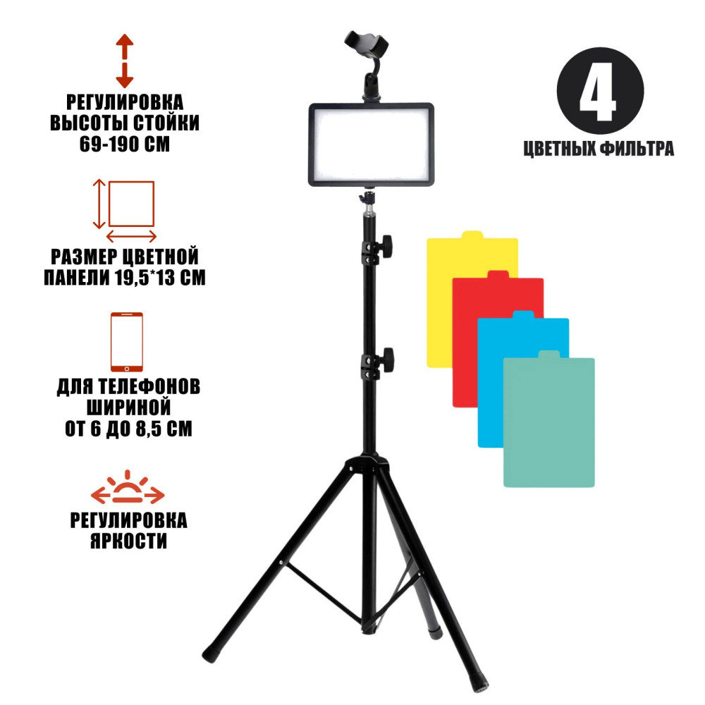 Портативная светодиодная LED панель RAG-1T3JBH с цветными фильтрами и держателем для телефона обеспечивает удобное и качественное освещение для фото, видео, влогов и тик-токов. Напольный штатив с регулируемой высотой и универсальный держатель позволяют разместить панель под любым углом, освобождая руки для творчества. Светодиодная панель работает от USB, что делает её удобной для использования как дома, так и на улице.