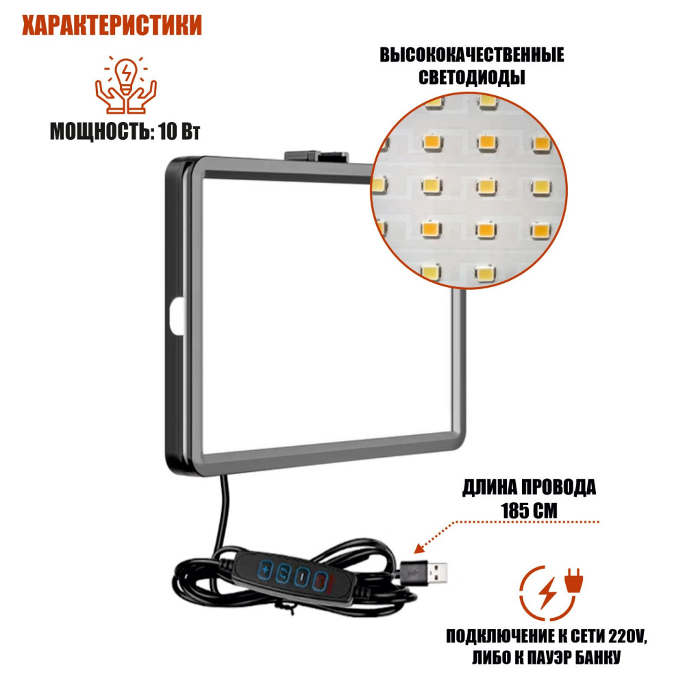 Портативная светодиодная LED панель RAG-1T3ST с настольным пантографом и держателем для телефона обеспечивает удобное освещение для фото, видео, влогов и тик-токов. USB-питание позволяет использовать панель дома или на улице с пауэрбанком, а цветные фильтры (зеленый, желтый, синий, красный) создают разнообразные световые эффекты. Панель легко закрепляется под нужным углом с помощью шарнира и держателя, а длина провода 185 см обеспечивает удобство работы.
