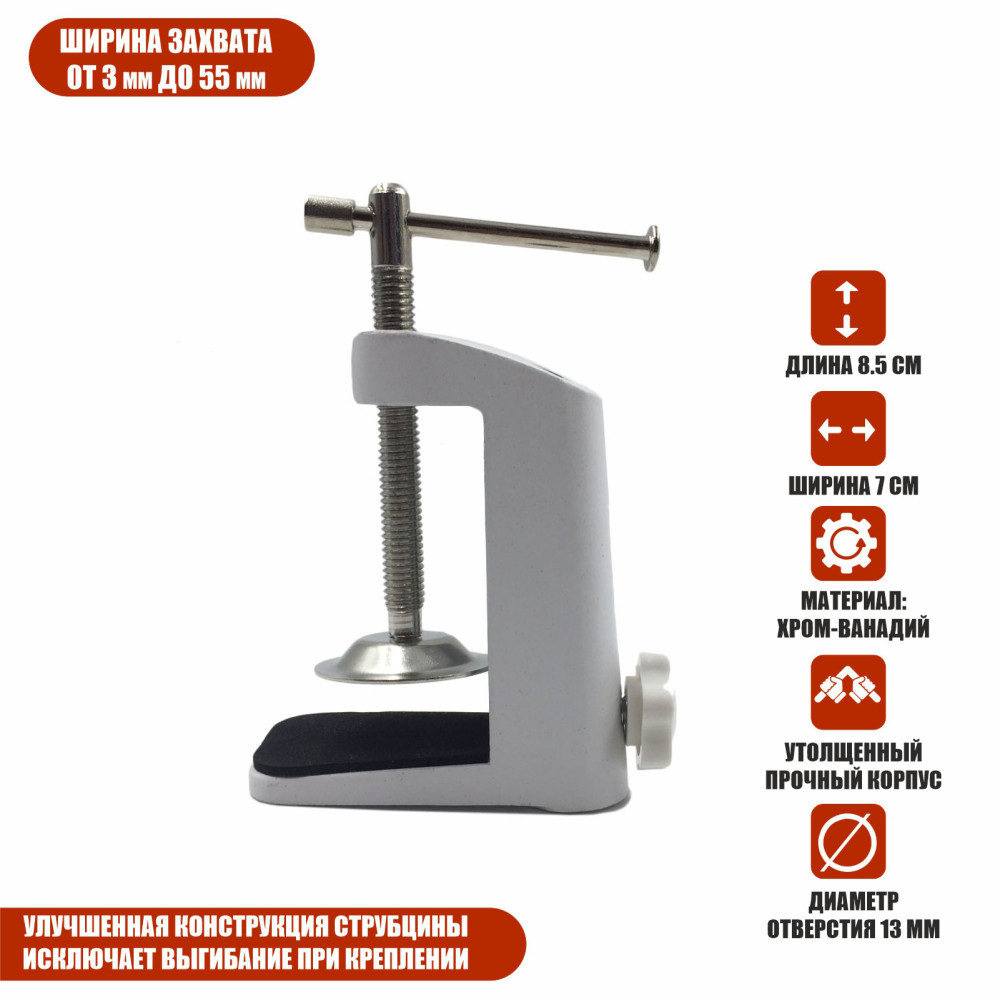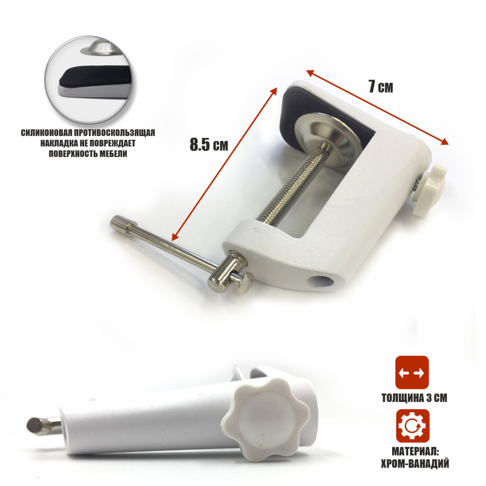 Струбцина усиленная белая предназначена для надежного крепления косметологического оборудования, включая лампы-лупы и светильники, на столах или других поверхностях толщиной до 55 мм. Прочная конструкция обеспечивает стабильность работы и защищает оборудование от случайного сдвига или выгибания пантографа. Усиленная струбцина — важный аксессуар для салонов красоты, студий и домашних мастерских, где требуется безопасная фиксация оборудования.