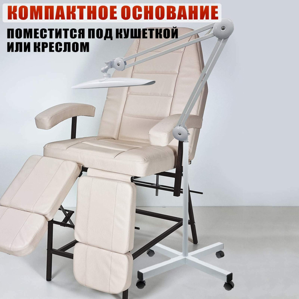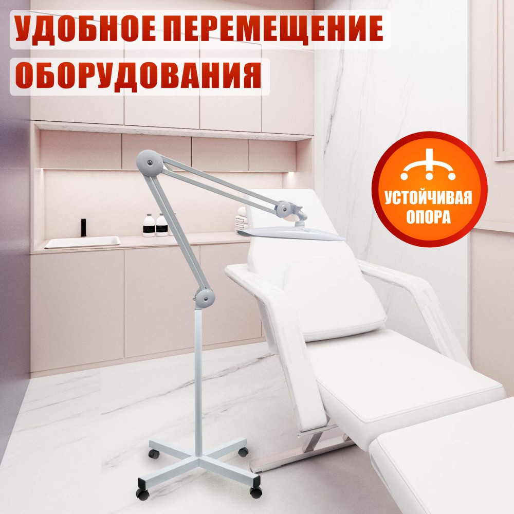 Главная особенность этой модели — мобильная стойках на колесах, которая позволяет легко перемещать лампу по кабинету и устанавливать её в нужное положение. Благодаря регулируемой высоте и углу наклона мастер может настроить освещение максимально удобно для процедуры.