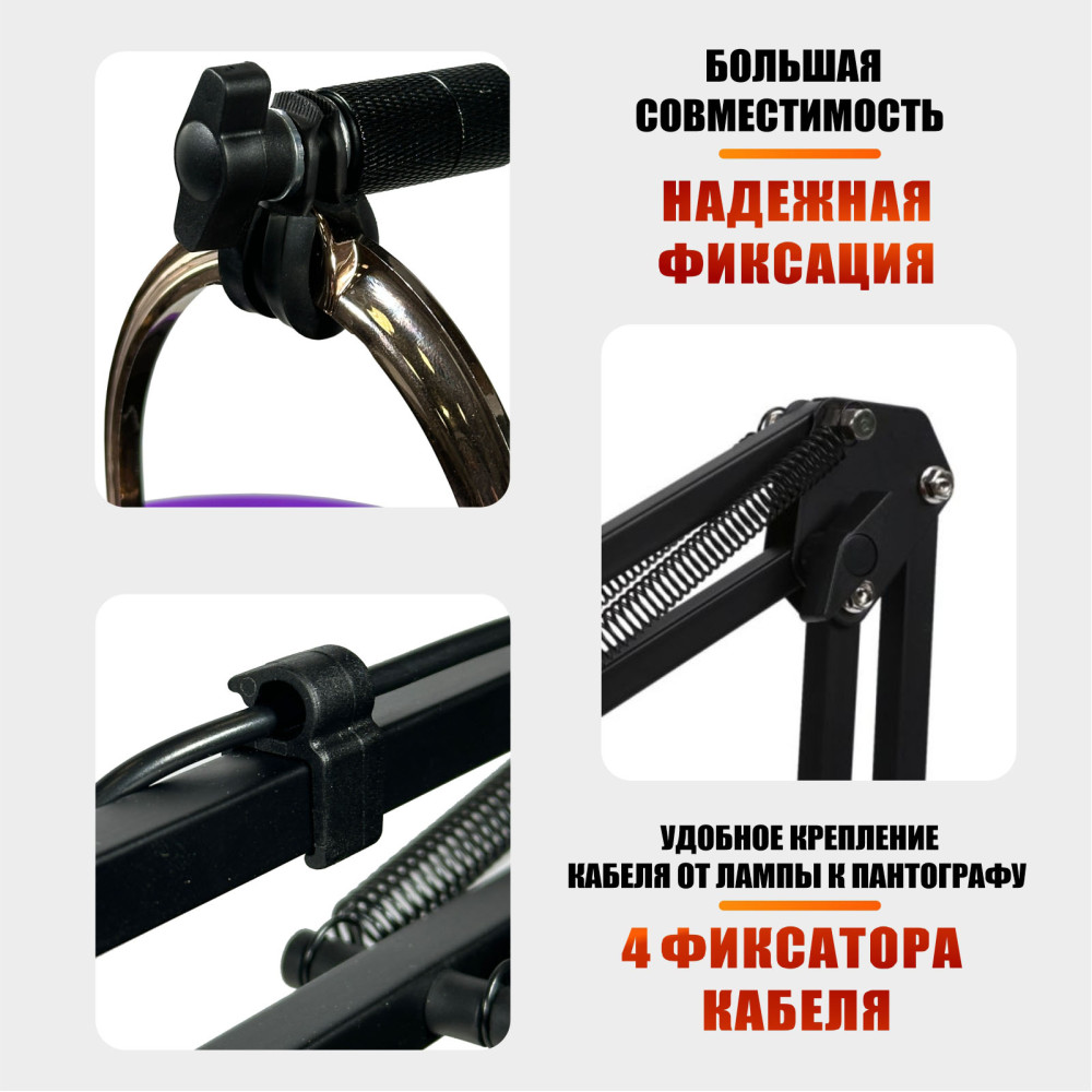 Крепление без упора для маникюрной лампы с ручкой на пантографе NBS — незаменимый аксессуар для мастеров маникюра и педикюра. Оно обеспечивает стабильную фиксацию лампы, освобождая руки для работы с клиентом. Пантограф позволяет изменять высоту и угол наклона лампы, что делает процесс сушки ногтей комфортным и безопасным. Усиленная струбцина обеспечивает надёжное закрепление на столе толщиной до 5 см, а держатели проводов помогают аккуратно расположить кабели, предотвращая их запутывание. Крепление совместимо с большинством моделей LED и УФ ламп с ручкой, а также поддерживает доступность всех комплектующих для ремонта или замены на сайте Krasograd.ru, что экономит деньги и снижает количество отходов.