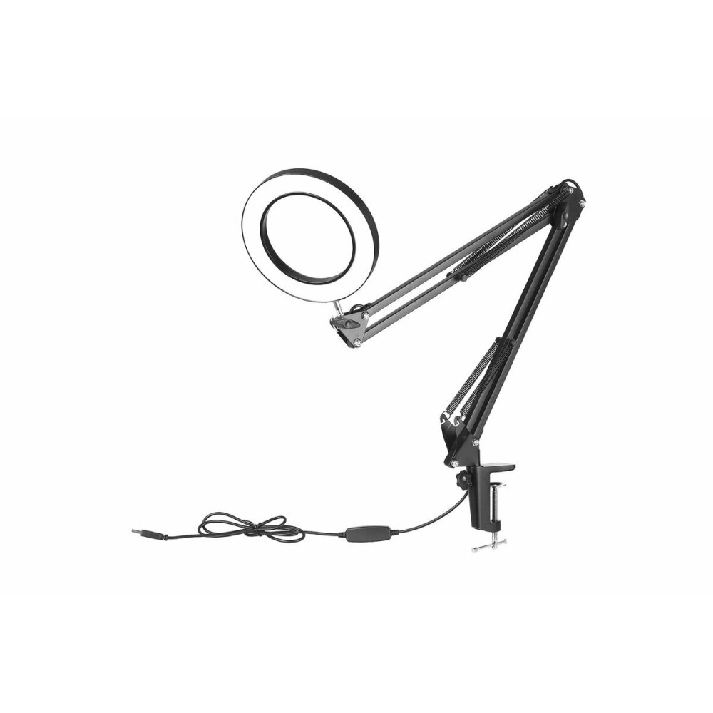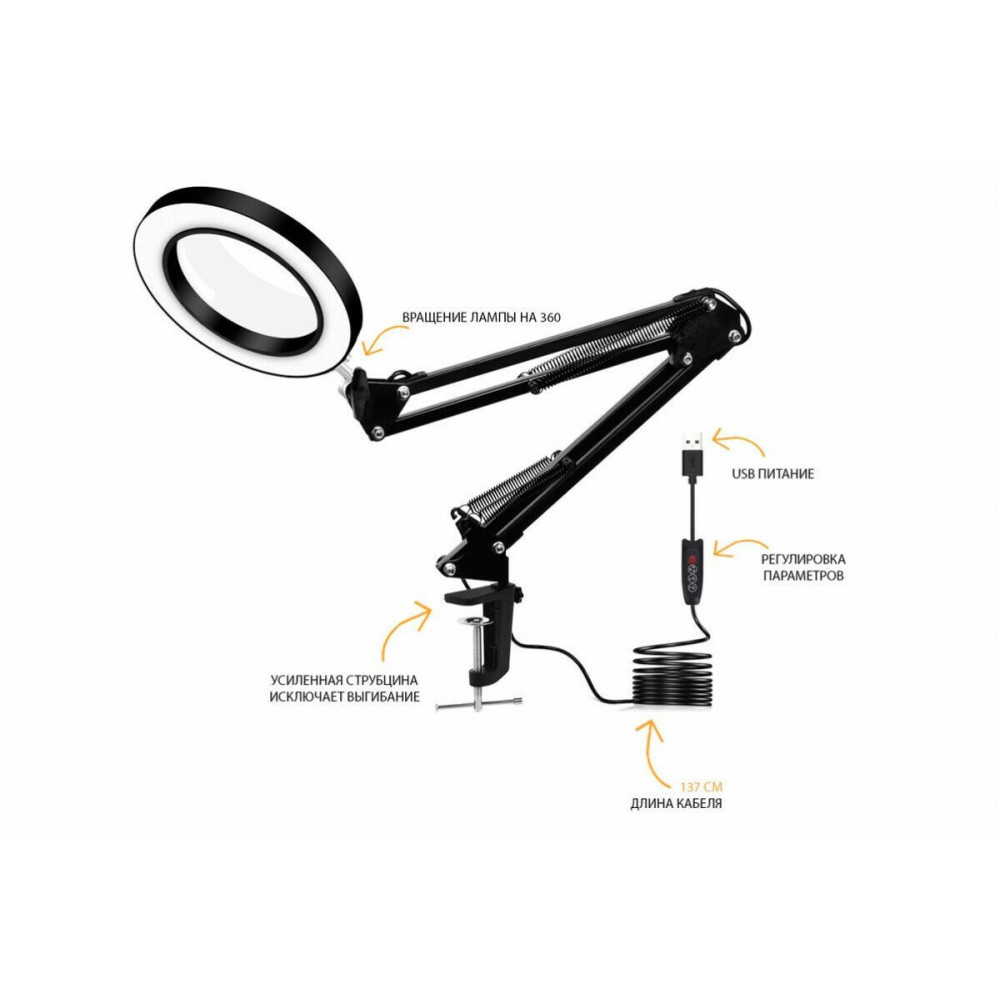 Настольная лампа-лупа LN-22 на усиленной струбцине предназначена для увеличения мелких предметов и работы с деталями. Линза из качественного стекла, бестеневая LED-подсветка и удобный пантограф позволяют точно регулировать положение лампы и обеспечивают комфортную работу. Три цветовых режима и регулировка яркости делают модель универсальной для косметологии, ювелирных и технических работ.