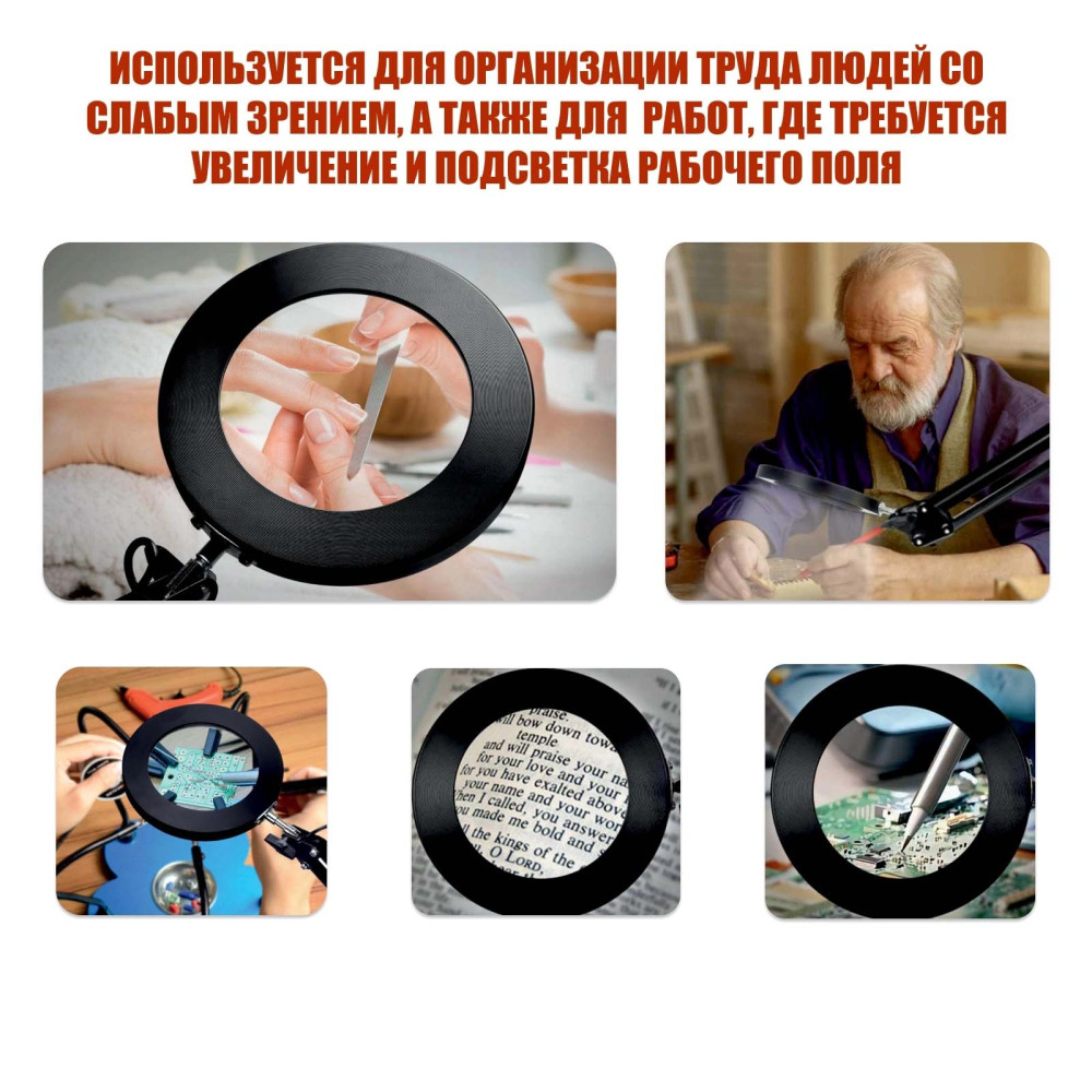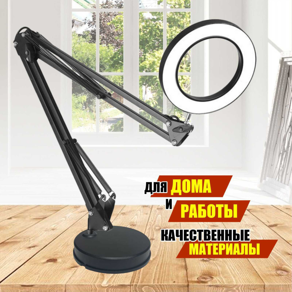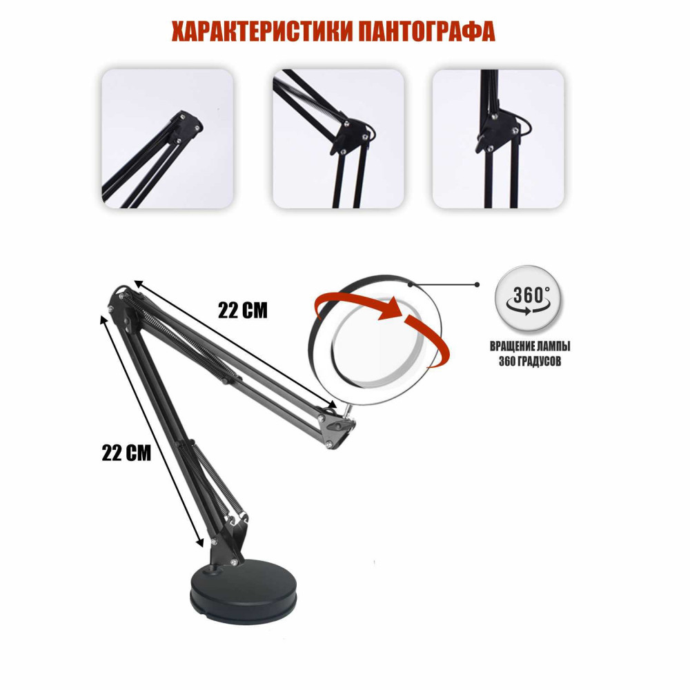 Лампа-лупа LN-22B на настольной стойке предназначена для удобного визуального увеличения мелких предметов и их деталей. Оптическая система состоит из качественной стеклянной линзы, устойчивого пантографического механизма и равномерной бестеневой LED-подсветки. Лампа оснащена тремя цветовыми режимами — тёплым, нейтральным и холодным, которые легко переключаются кнопкой на проводе. Источник света не мерцает и снижает нагрузку на глаза при длительной работе. Устойчивое основание диаметром 18 см обеспечивает надёжное размещение лампы на рабочем столе. Модель подходит для профессиональных и бытовых задач, когда необходимо дополнительное увеличение и качественная подсветка рабочей зоны.