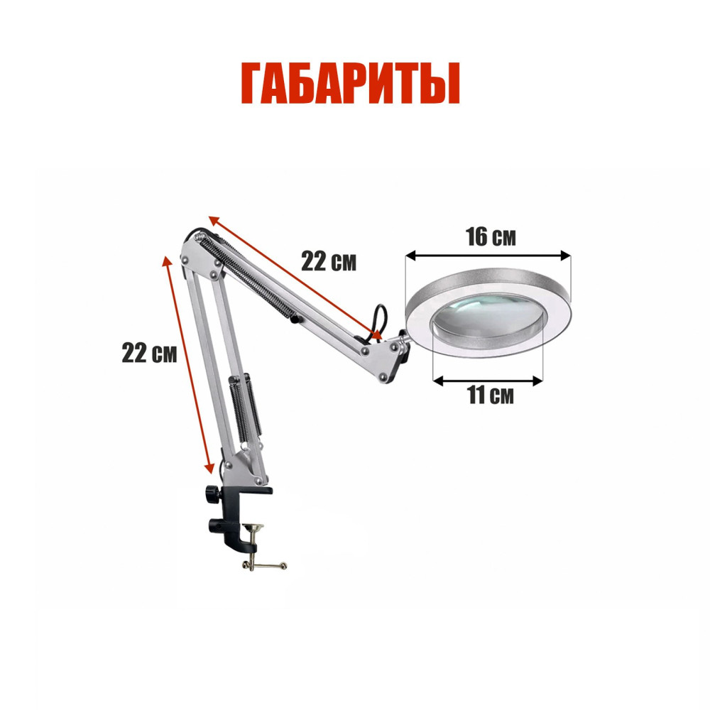 Лампа лупа LED LN-22W белая на усиленной настольной струбцине для горизонтального и вертикального крепления, с регулировкой яркости и 3 режимами света