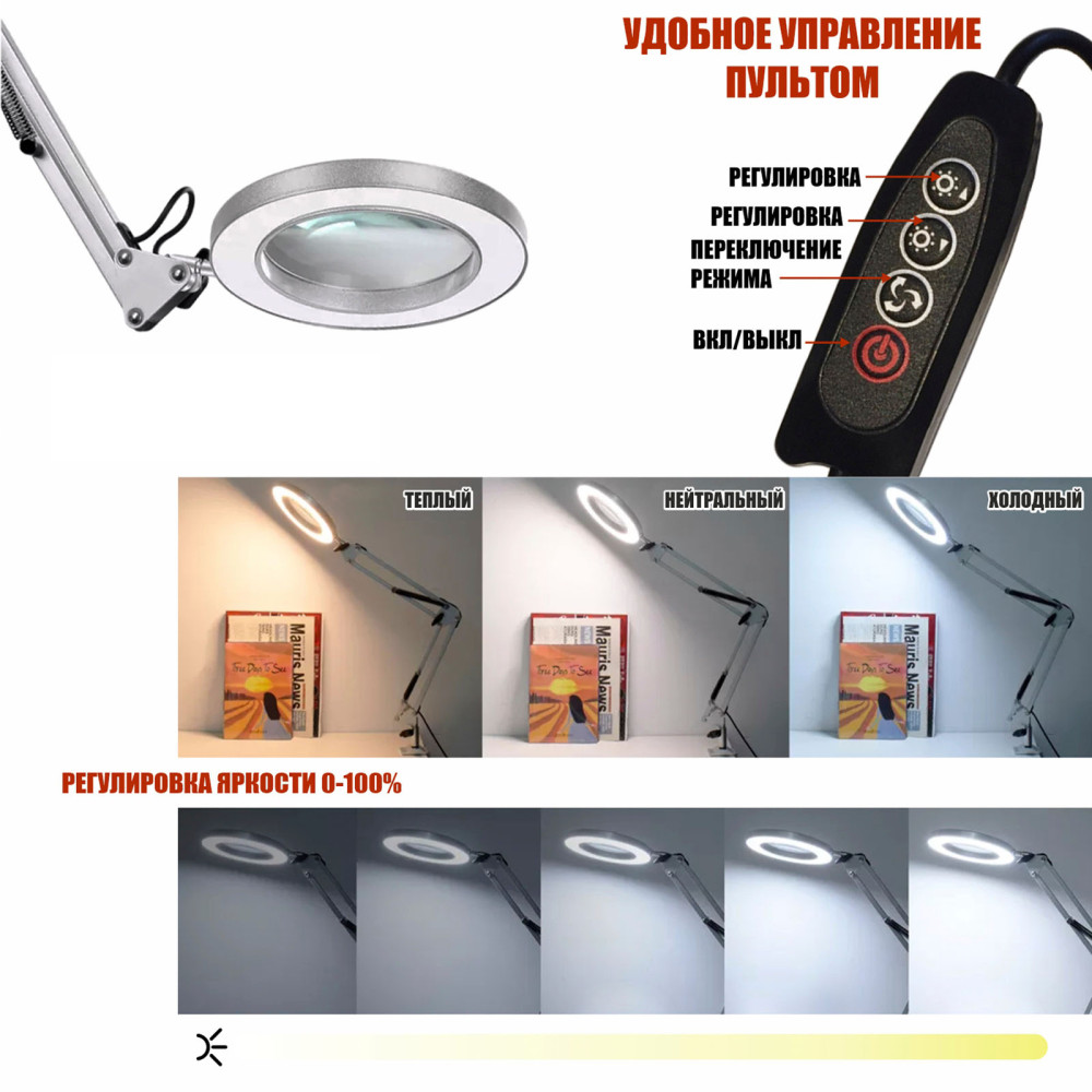 Лампа-лупа LN-22W2SB с LED подсветкой и пантографом для горизонтального и вертикального крепления — удобный настольный инструмент для увеличения мелких предметов. Три режима цвета и регулировка яркости обеспечивают комфортную работу, а складная конструкция и бестеневая подсветка делают лампу универсальной для косметологии, ювелирных и технических работ.