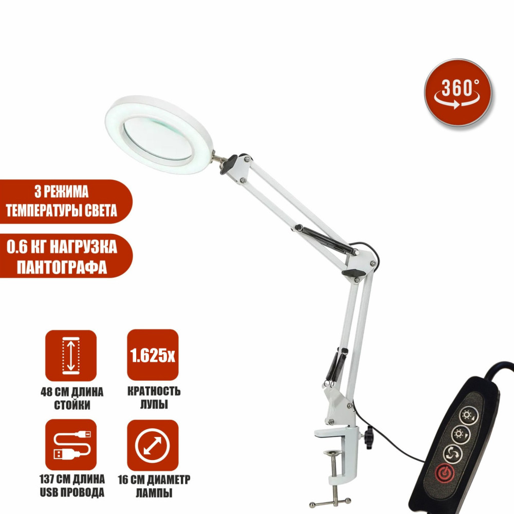Настольная лампа-лупа LN-22W на усиленной белой струбцине предназначена для увеличения мелких предметов и работы с деталями. Линза из качественного стекла, бестеневая LED-подсветка и удобный пантограф позволяют точно регулировать положение лампы и обеспечивают комфортную работу. Три цветовых режима и регулировка яркости делают модель универсальной для косметологии, ювелирных и технических работ.