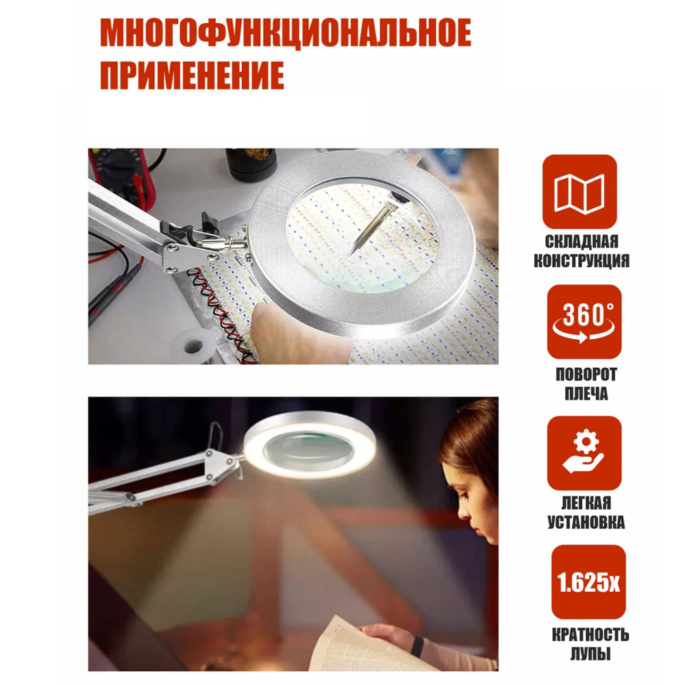 Настольная лампа-лупа LN-22W оснащена стеклянной линзой диаметром 11 см и бестеневой светодиодной подсветкой, что обеспечивает качественное увеличение и равномерное освещение рабочего поля. Пантографический механизм позволяет регулировать высоту и положение лампы на 360°, фиксируя её под нужным углом. Модель имеет три цветовых режима — тёплый, нейтральный и холодный — которые легко переключаются кнопкой на проводе. Лампа используется в косметологии, тату-индустрии, ювелирных мастерских, радиомонтаже, ремонте часов, биологии, медицине, швейных и вышивальных работах. Усиленная струбцина надёжно фиксирует лампу на столе, а складная конструкция экономит место при хранении.