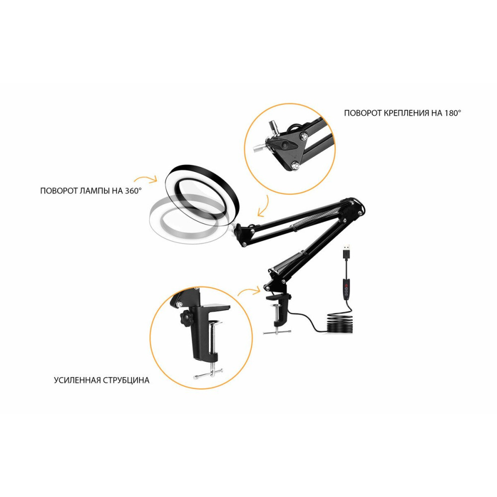 Лампа лупа LED LN-33 чёрная на усиленной настольной струбцине и пантографе, с регулировкой яркости и 3 режимами света