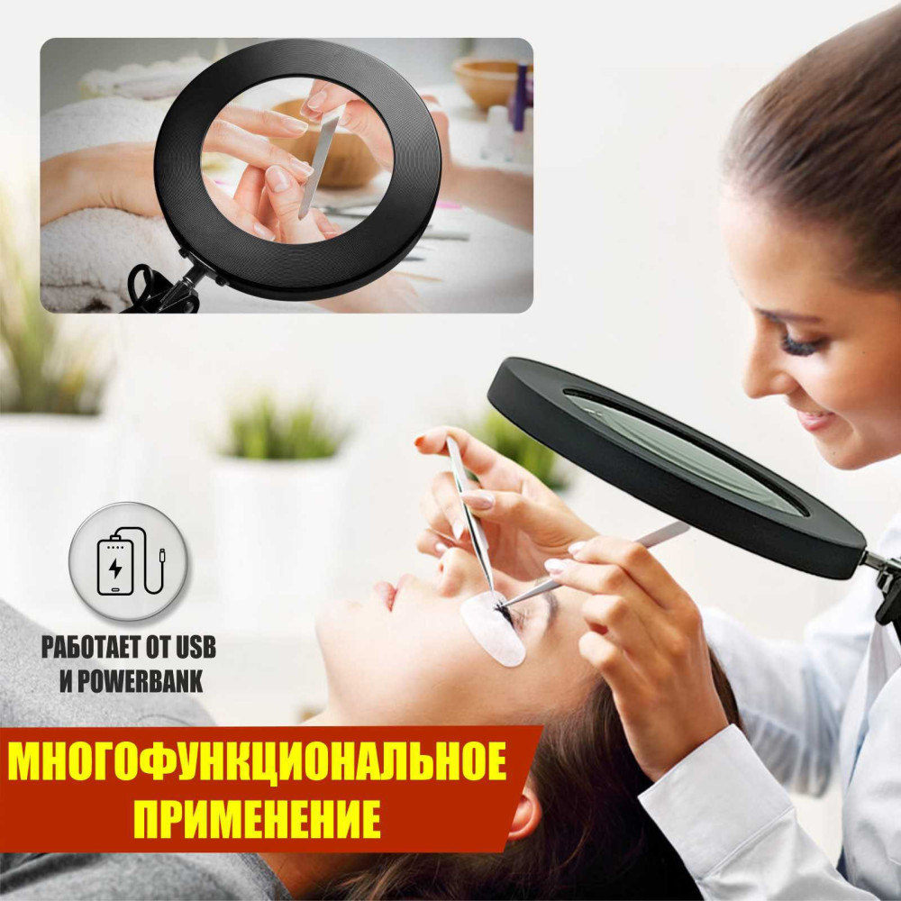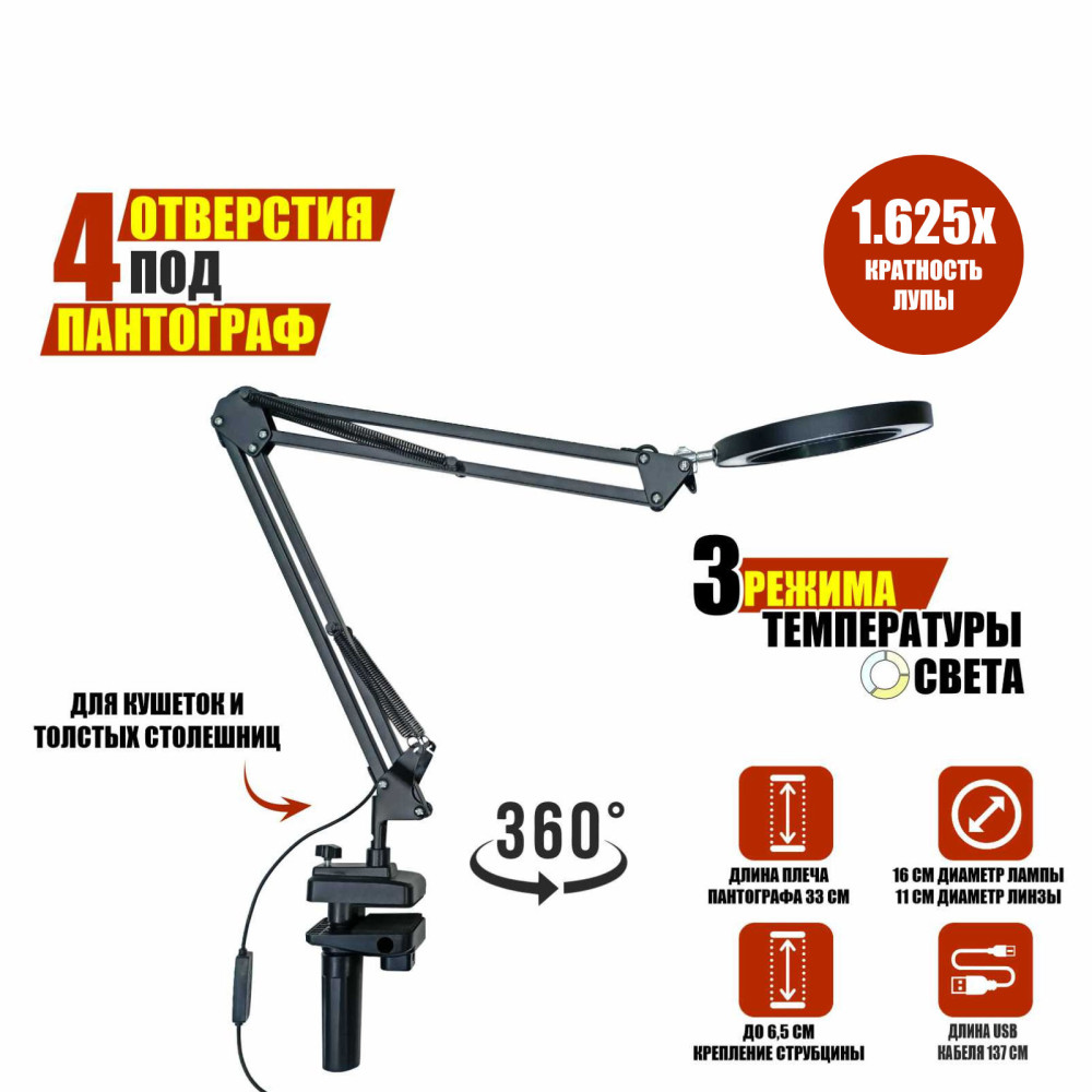 Лампа-лупа LN-33-PS65 с LED подсветкой и пантографом предназначена для работы с толстым столом или кушеткой до 6,5 см. Три цветовых режима и регулировка яркости обеспечивают комфортную работу, а струбцина с 4 отверстиями позволяет закрепить лампу горизонтально или вертикально. Универсальный настольный инструмент для косметологии, ювелирных, технических и медицинских работ.