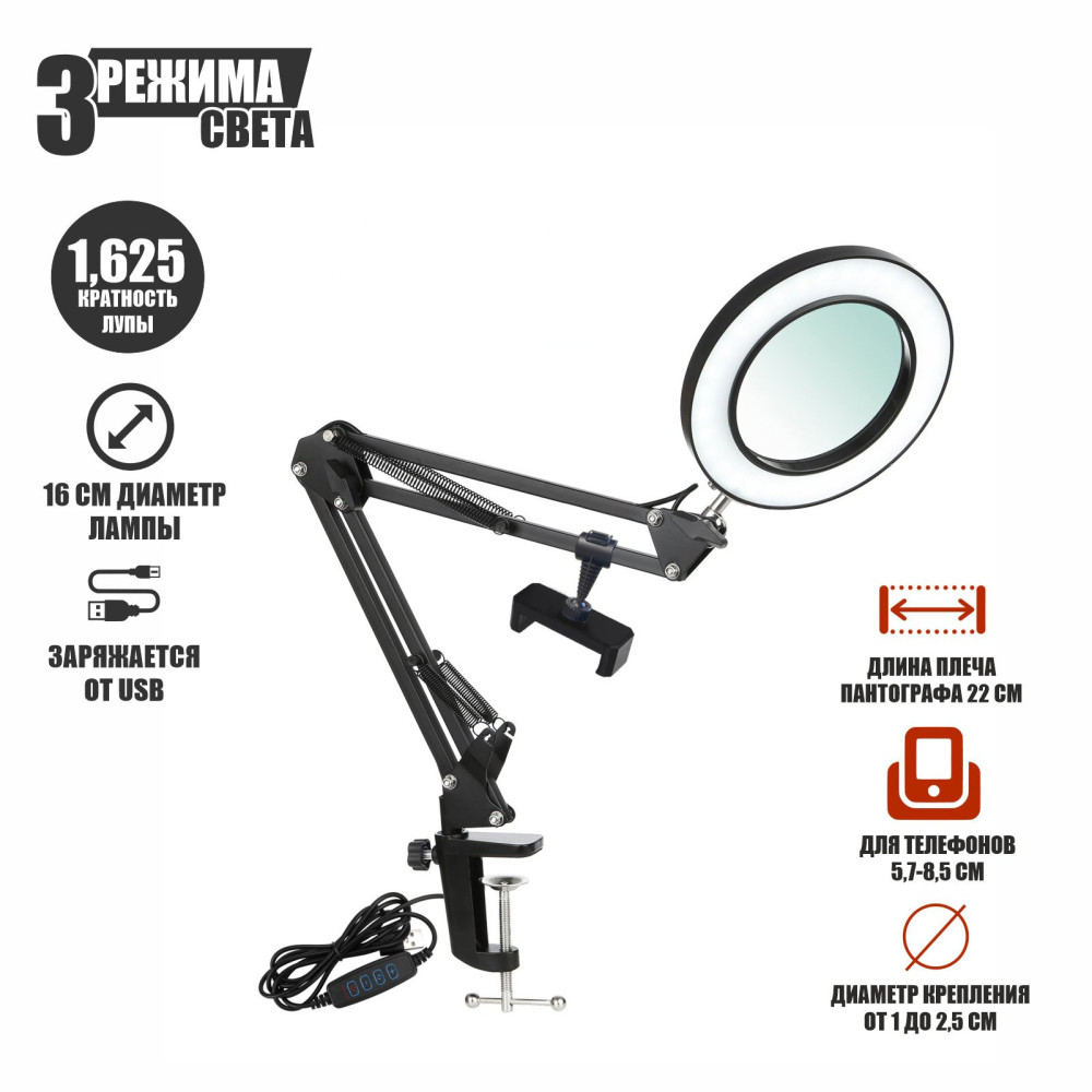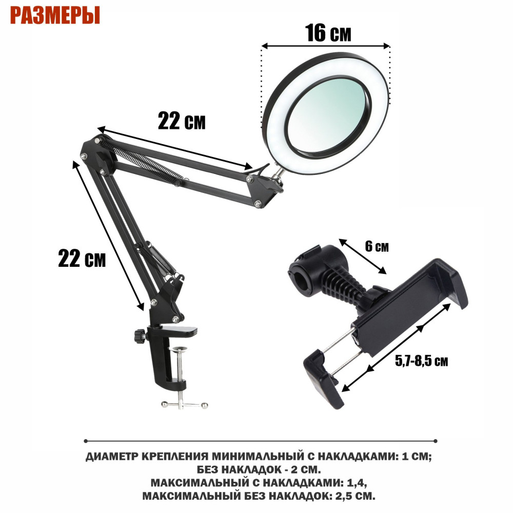 Лампа лупа настольная LN-22 с держателем телефона на зажиме и усиленной струбциной, черная на пантографе