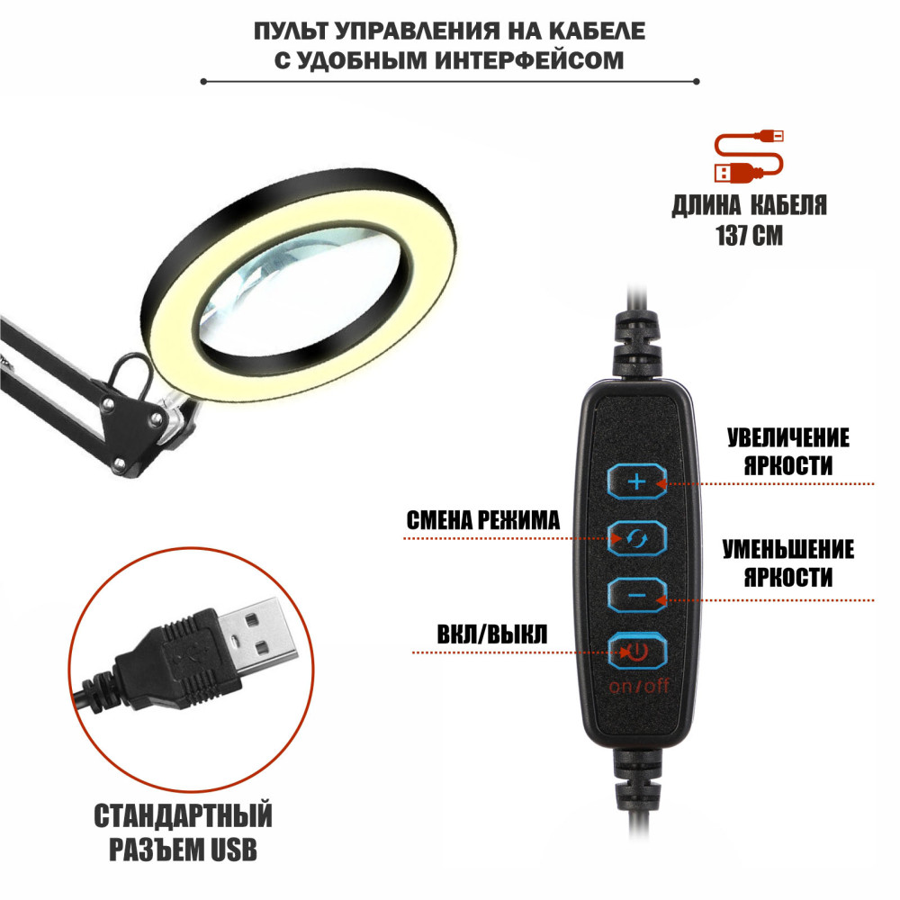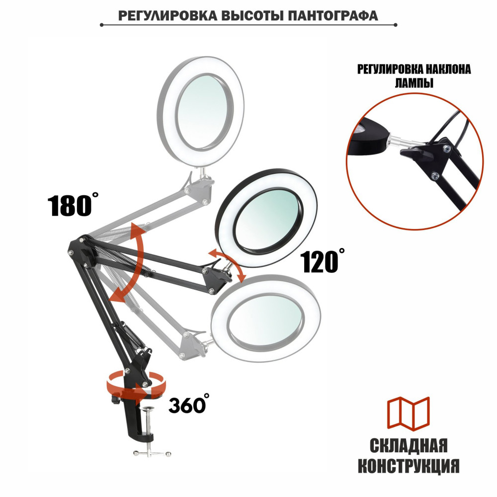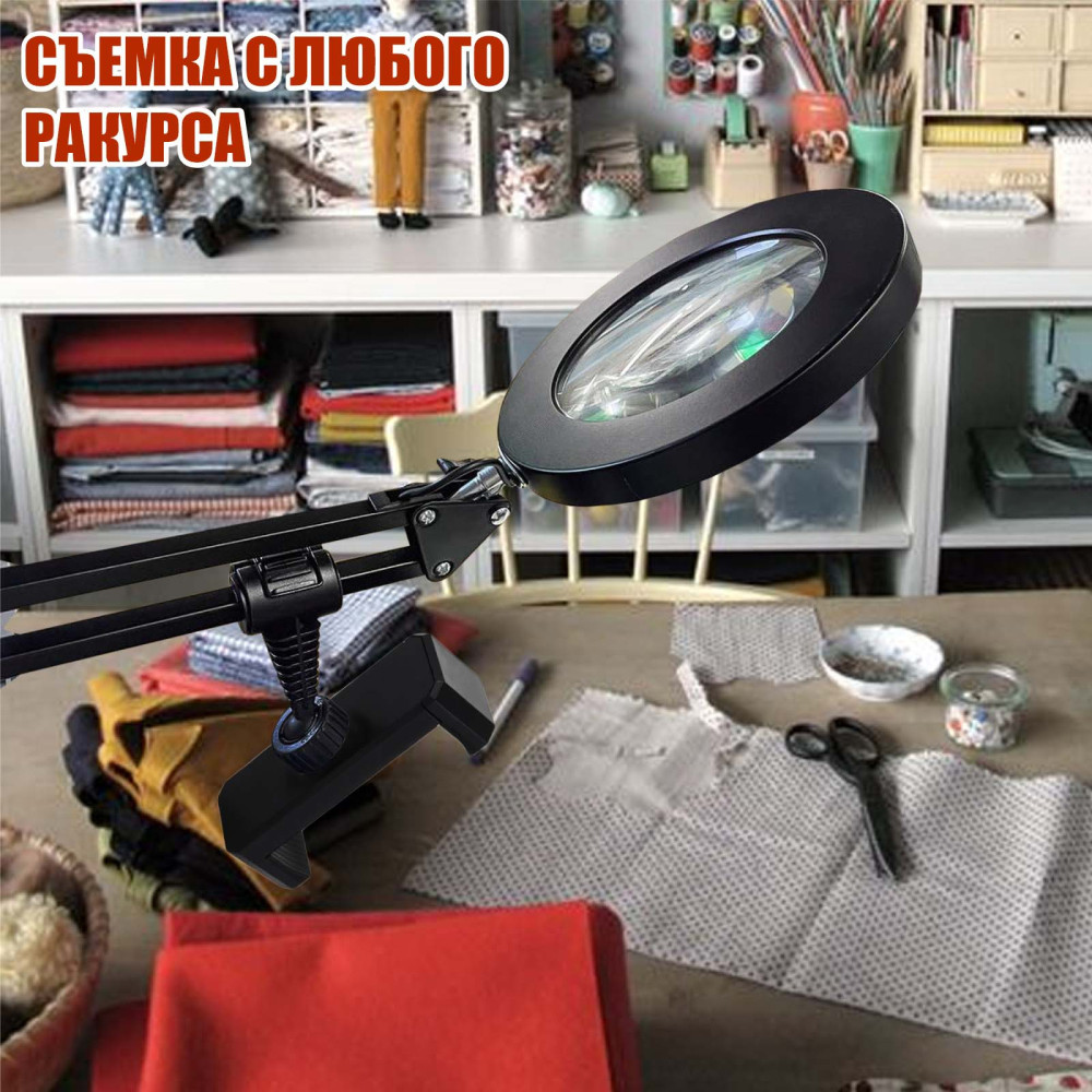Настольная лампа-лупа LN-22 с LED подсветкой и держателем телефона — универсальное решение для увеличения мелких деталей и съемки мастер-классов. Усиленная струбцина обеспечивает надежное крепление на поверхности толщиной до 50 мм, а пантограф позволяет регулировать положение лампы на 360°. Три цветовых режима и регулировка яркости делают работу комфортной даже при длительном использовании.