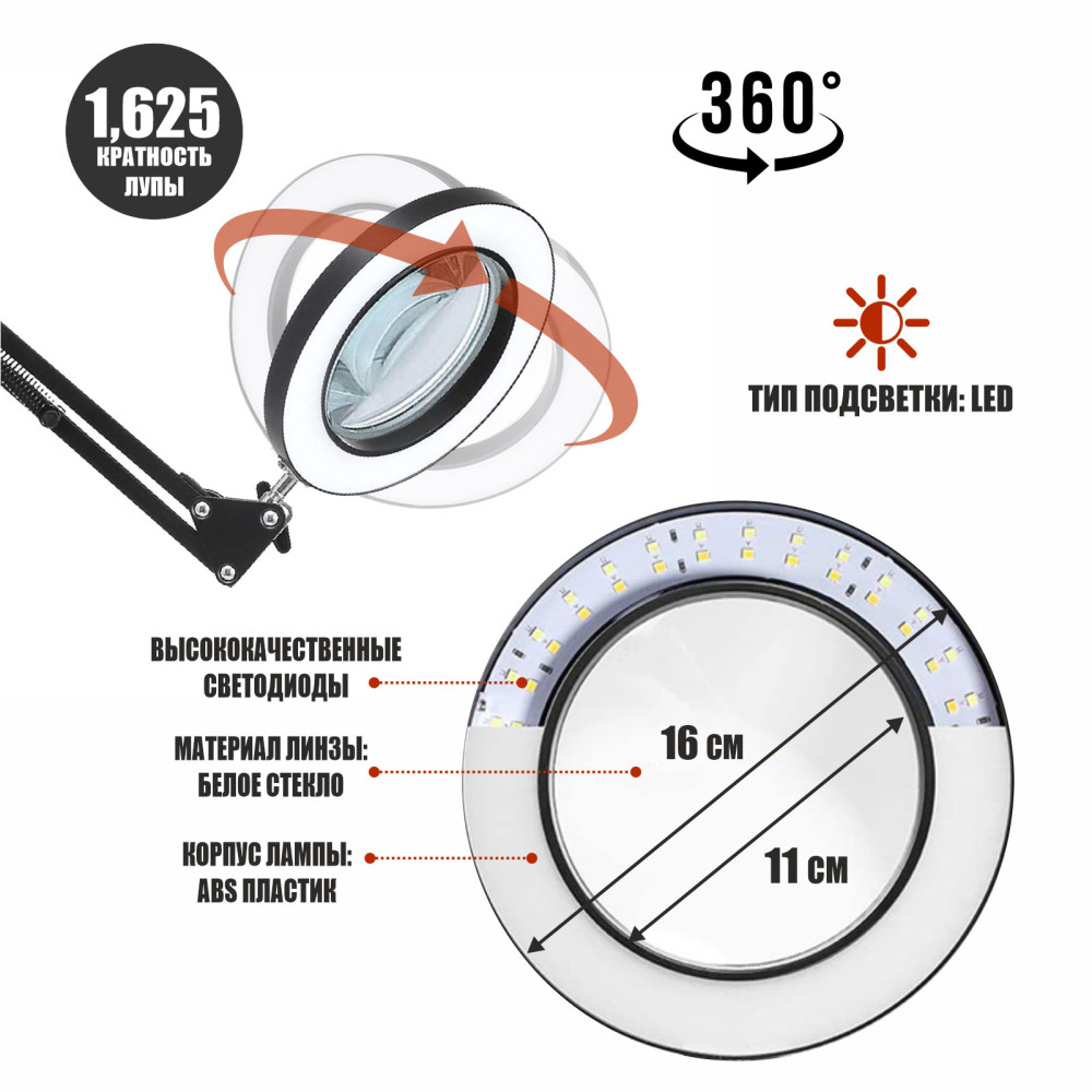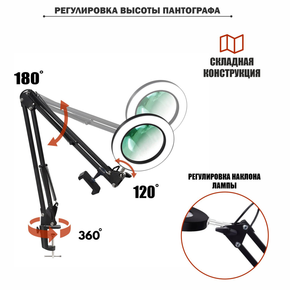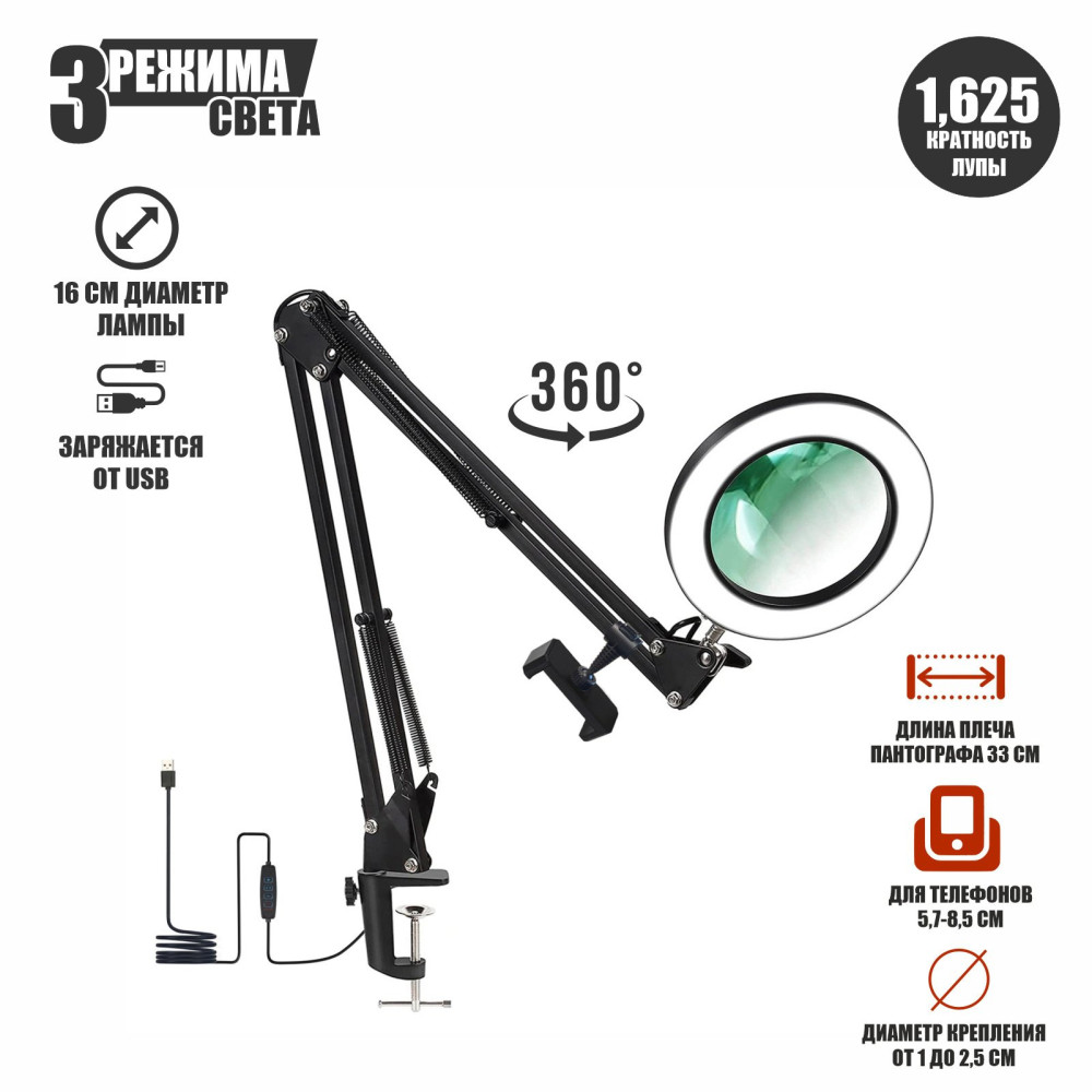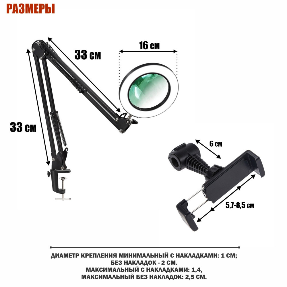 Лампа лупа настольная LN-33 черная на пантографе с держателем телефона до 85 мм на зажиме и усиленной струбциной