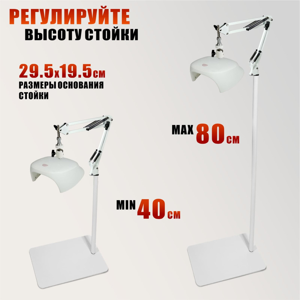 Профессиональная лампа для сушки ногтей SUNC3 мощностью 54 W с LCD-таймером и режимом низкотемпературного отверждения, закреплённая на регулируемой напольной стойке с пантографом и удлинителем кабеля – надёжное и удобное решение для мастеров маникюра и педикюра.