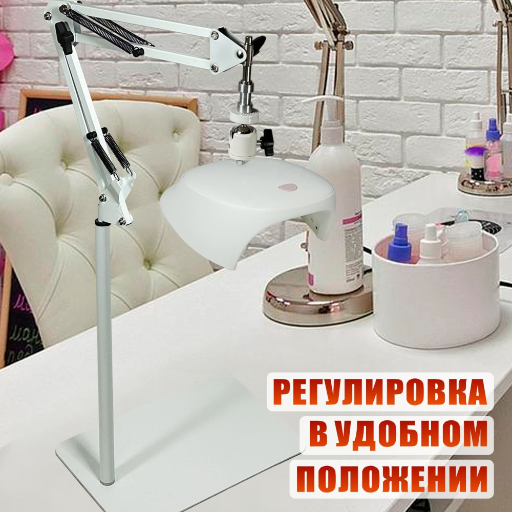 Пантограф позволяет плавно менять угол и высоту, а напольная стойка подходит как для работы за столом, так и возле педикюрного кресла. Удлинитель USB делает использование максимально удобным и мобильным.