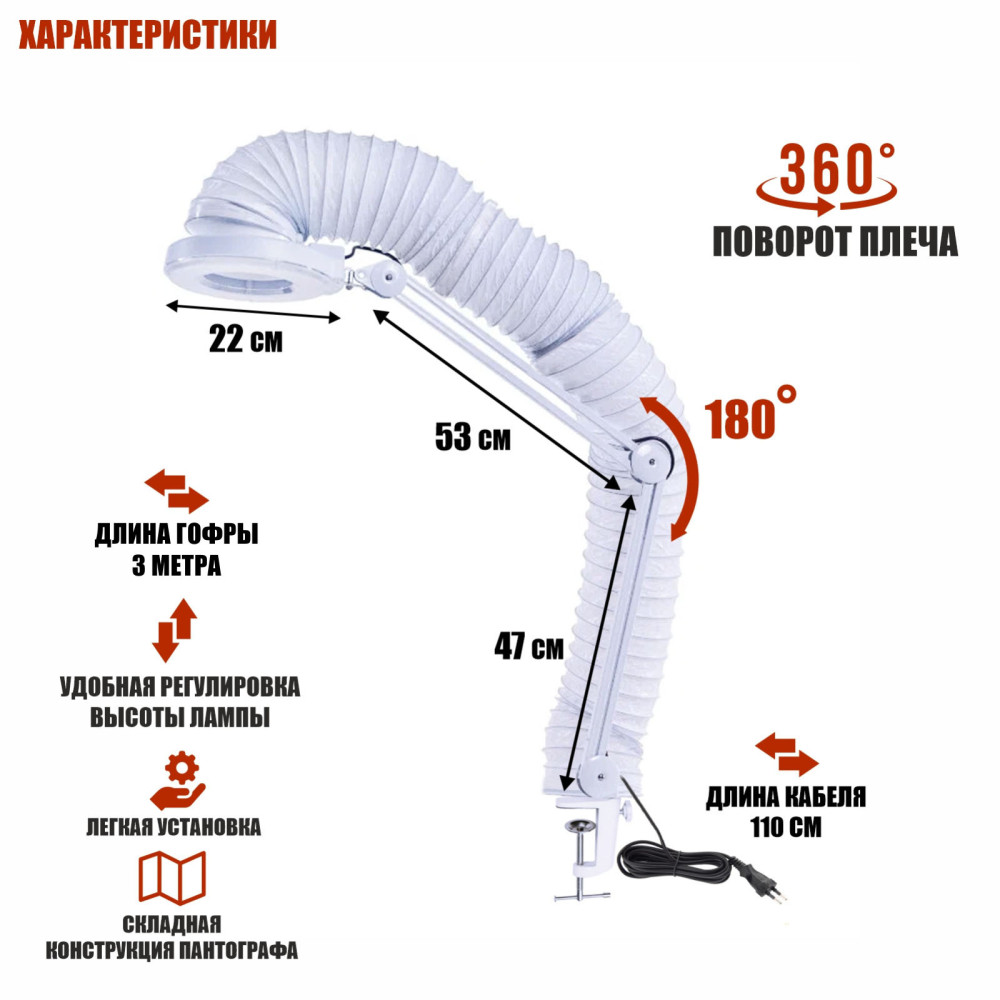 Лампа LN-5-GOF300 с гибкой гофрой D125 мм, 3 м — удобное и безопасное решение для маникюра и педикюра. Настольное крепление с усиленной струбциной обеспечивает стабильность на рабочем столе и освобождает руки мастера. LED подсветка создаёт бестеневое освещение, а гофра позволяет подключить вытяжку для удаления пыли и запахов. В нашем магазине Krasograd.ru доступны все аксессуары и комплектующие для профессиональной работы.