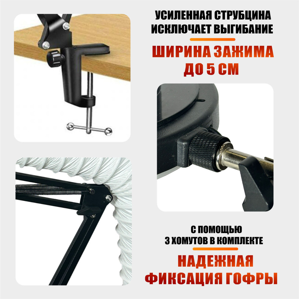 Лампа SL-156-150 с LED подсветкой RGB и фланцем под гофру 150 мм обеспечивает качественное освещение и чистоту рабочего пространства при проведении маникюра, педикюра, наращивания ресниц и других косметологических процедур. Устройство оснащено пантографом с настольной усиленной струбциной, что позволяет надежно закрепить лампу на горизонтальной поверхности и свободно регулировать высоту и угол наклона. В комплекте есть гофра длиной 2 м для отвода пыли и запахов, а три режима цвета света и регулируемая яркость создают комфортные условия для работы. Этот аксессуар подходит как профессионалам, так и любителям, обеспечивая удобство, эффективность и безопасность процедур.